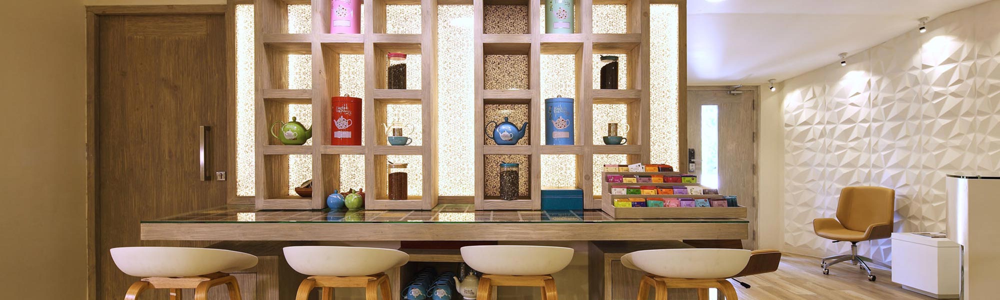 The design was inspired by the dynamism and energy of the people of Amazone Teas and their brand, which promises organically harvested tea and value from tip to cup. The interior attempted to project out this personality in visual and spatial form. Colour schemes, textures and lighting has been carefully designed to optimize the comfort and work efficiency The interior was mainly designed incorporating colours, textures and shapes inspired by the tea leaf and its flavours. |